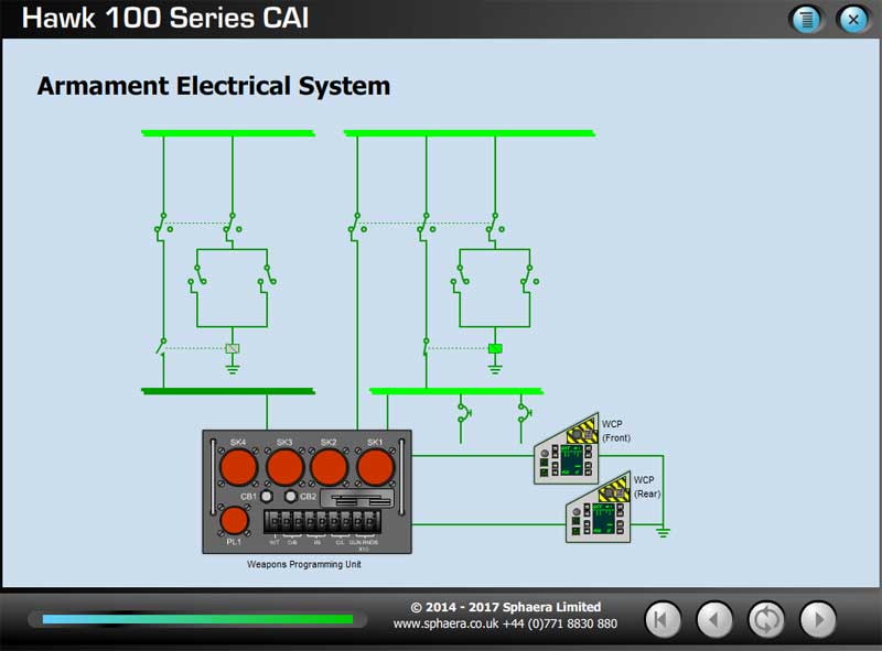 System diagrams (for main systems such as hydraulics, electrics, fuel, engine or weapons control) can be built up using a series of easy to understand steps, enabling users to learn about each component. Then, when the system is complete, users can set up the system conditions and view the operation under those conditions.
